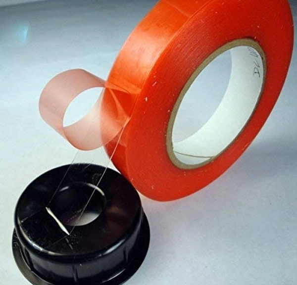 - This clear double-side tape is a double-coated film, consisting of an acrylic adheisve with extremely high adhesion power and high instant tack, coated on a transparent polyester carrier. Light and moisture resistant. Permanently bonds plastics and metals. Replaces epoxies and other adhesives. Tape are available in